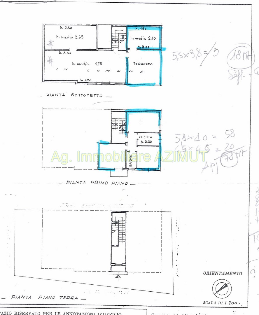In piccola palazzina Bifamiliare, su tre livelli, costruita nel '67 , vendesi appartamento indipendente, composto da: Piano Primo di mq. 78 circa,, ingresso comune all'altro appartamento, soggiorno, cucina, n. 2 camere letto di cui una con balcone, bagno finestrato; Piano Sottotetto di mq. 22 altezza media h. 2.40, terrazzo panoramico di mq. 33 circa; Piano Terra magazzino altezza h. 3.00 di mq. 60; Piano Scantinato altezza h. 2.80 di mq. 60 circa. Al Piano Terra mq. 40 circa di scoperto esclusivo. Finiture anni '90, termo autonomo a gas metano Per ulteriori informazioni chiamare Ag. Immobiliare Azimut al 335 7809070