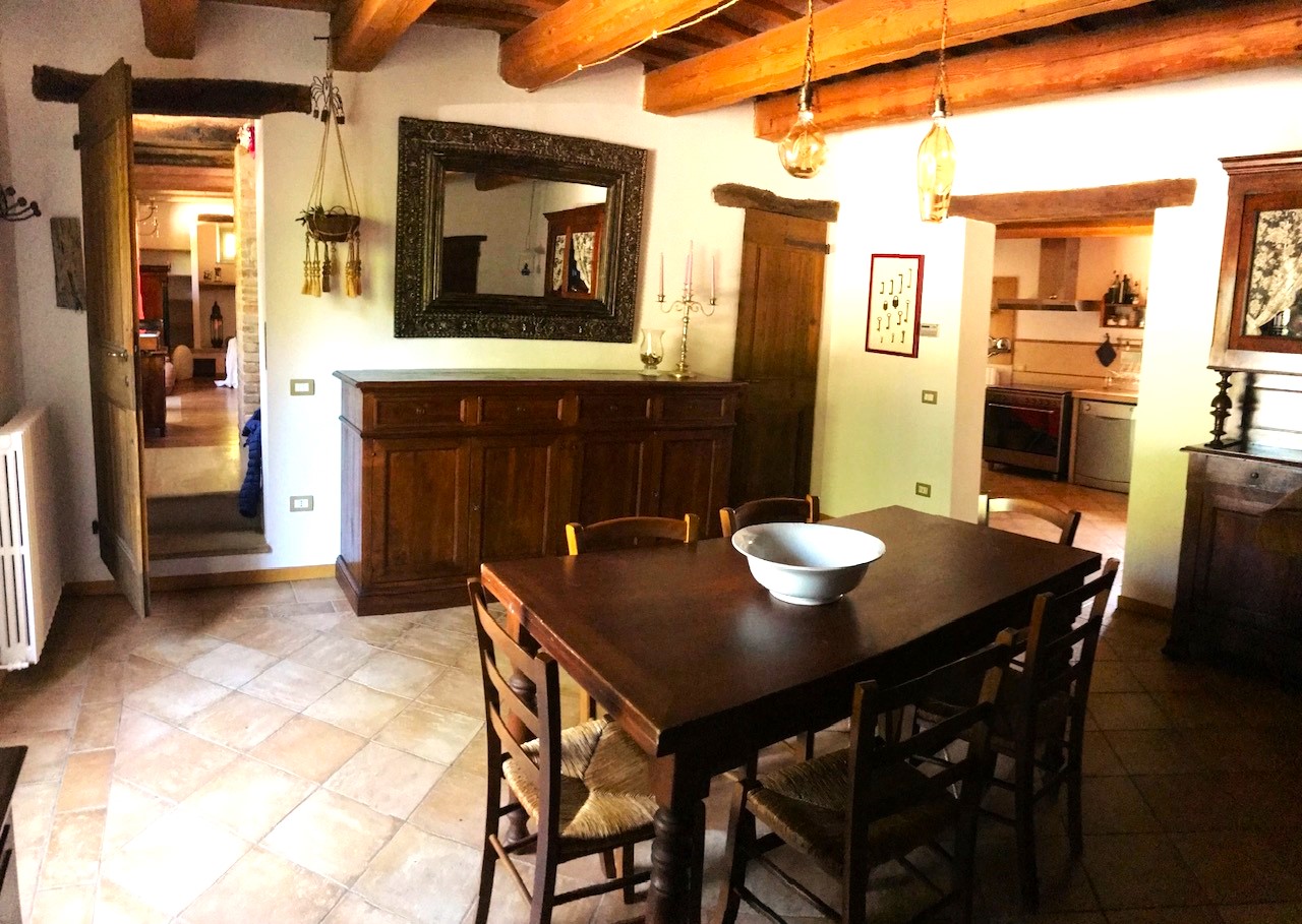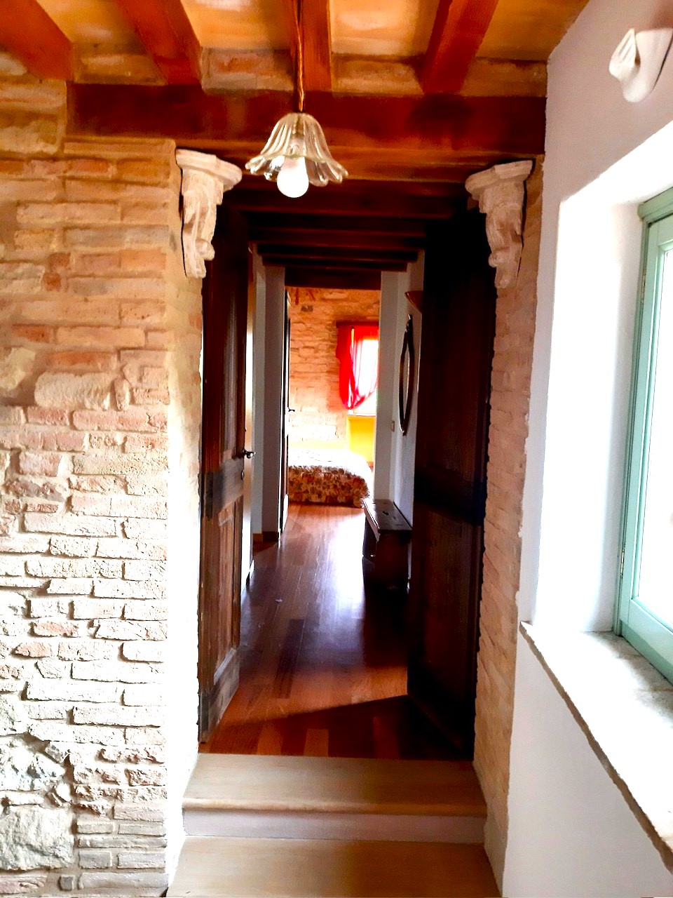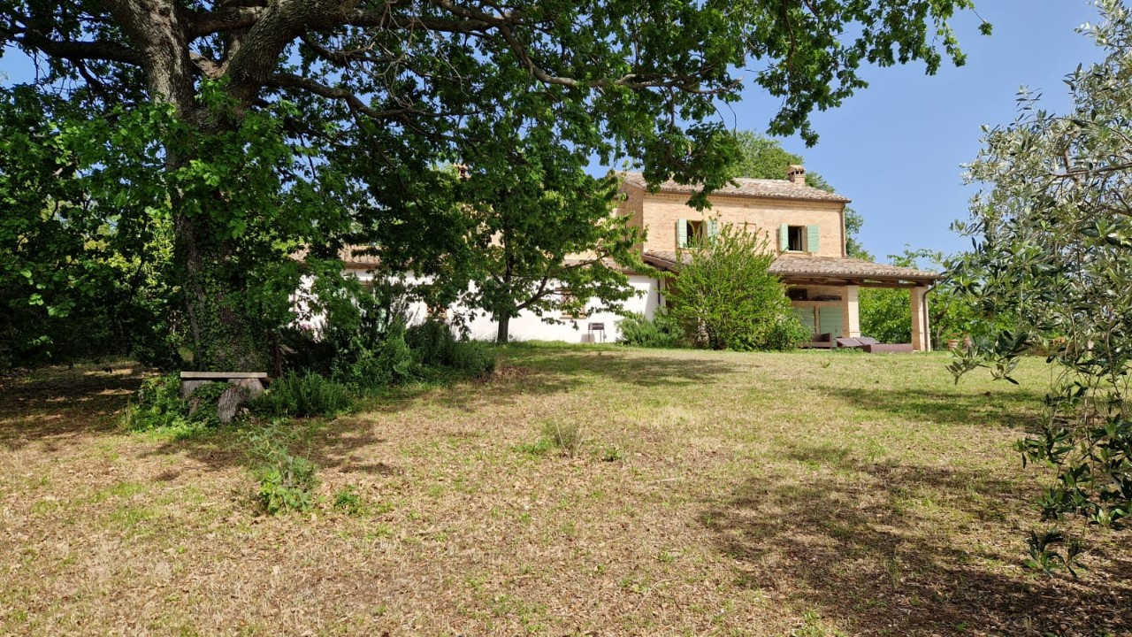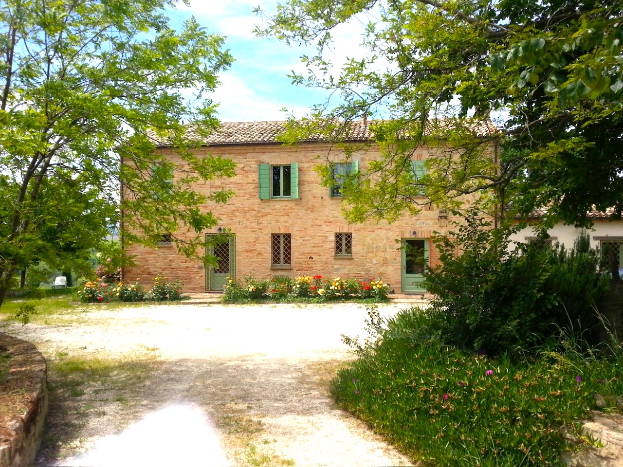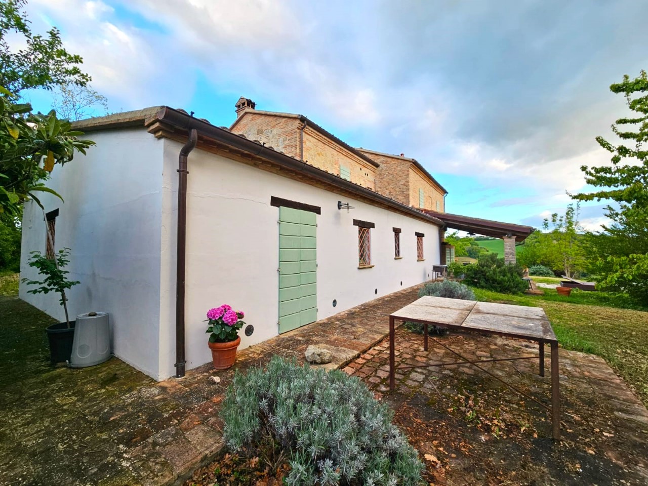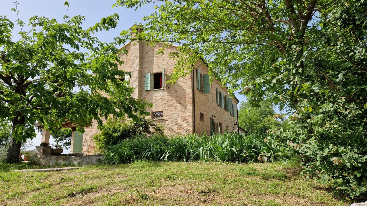 " CASA DELLE RONDINI " si trova incastonata nelle colline marchigiane, in splendida posizione panoramica e tranquilla, nel comune di Fano, a 5 Km. circa dal Centro e dalle Spiagge; a pochi Km. da Pesaro, Urbino, Gradara, Mondavio e dai tanti Borghi che hanno reso grandi la Marche nel Medioevo e Rinascimento. La casa colonica, completamente ristrutturata nel 2002, di circa 290 mq. di superficie è composta dal corpo principale (casa padronale) e da una piccola dependance attigua completamente indipendente, in lotto di circa 3.500 mq. recintato piantumato con ulivi, alberi da frutta, cipressi e querce secolari. Il corpo principale di circa mq. 230 è disposto su due livelli: PIANO TERRA composto da cucina con vista sul giardino, sala da pranzo con camino, soggiorno di mq. 50 circa con camino, caratterizzato da soffitto a voltine originali, lavanderia e bagno di servizio; il portico di mq. 40 circa coperto e collegato da due porte finestre alla cucina ed al soggiorno, offre una splendida vista sulle colline circostanti e tramonti fantastici che si possono assaporare cenando all'aperto. PIANO PRIMO composto da n. 3 camere letto matrimoniali: una di mq. 26, una con soppalco di mq. 12 ed una con ampia cabina armadio e bagno esclusivo, bagno comune. DEPENDANCE di mq. 53 circa è composta da ampia zona living con soffitti alti e porta finestra che apre sul giardino, comprende soggiorno/pranzo/cucina, ripostiglio, camera da letto matrimoniale, bagno con doccia. Alti soffitti, travi in legno a vista, parquet, pavimento in pianelle, lavandini in pietra caratterizzano le ottime finiture in tutta la casa, infissi interni ed esterni in legno douglas verniciato, finestre con doppi vetri. In un vano completamente interrato di circa mq. 14, separato dall'immobile sono presenti le apparecchiature tecniche ed autoclave di servizio per la cisterna di raccolta delle acque piovane. Impianto di riscaldamento con termosifoni a GPL, impianto antifurto volumetrico e perimetrale. Per maggiori informazioni chiamare Ag. Immobiliare AZIMUT al 335 7809070
