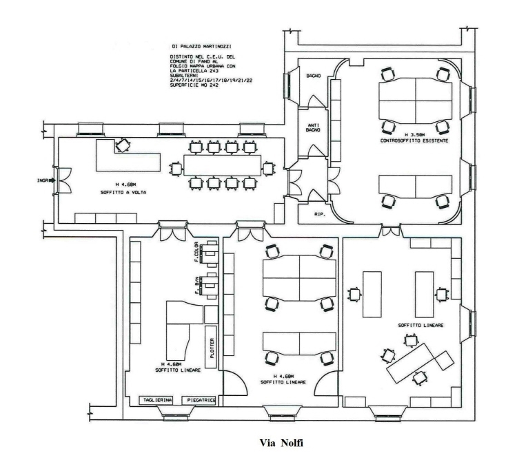 FANO: in Centro Storico, a due passi da Piazza XX Settembre, in palazzo storico MARTINOZZI, del '500, completamente ristrutturato fine anni '90, con adiacente parcheggio, si VENDE locale ad uso ufficio- studio privato, al Piano Primo, di mq. 242 circa, composto da ampio ingresso con soffitto a volta, n. 4 ampi locali, bagno ed antibagno. Termo autonomo, aria condizionata, cablaggio internet in tutti i locali. Adatto a studi- uffici o dove si richiede grande impatto o rappresentanza. Per maggiori informazioni chiamare Ag. Immobiliare AZIMUT al 335 78 09070